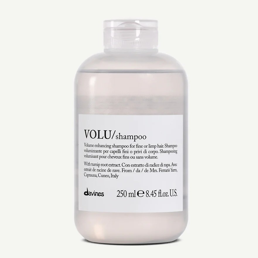Шампунь Davines VOLU Shampoo — мягкое очищающее средство для тонких и ослабленных волос, которым не хватает плотности. Не утяжеляет, придаёт прикорневой объем, делает пряди визуально более густыми и живыми с первого применения.